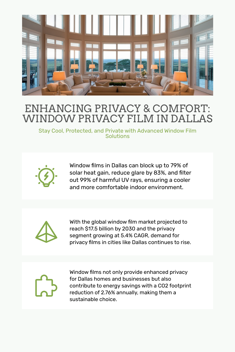 The global window films market size is projected to reach $17.5 billion by 2030, growing at a CAGR of 5.7% from 2021 to 2030. The privacy segment, in particular, is expected to grow at the highest CAGR of 5.4%, underscoring the increasing importance and demand for window privacy solutions across cities like Dallas. This growth is a testament to the effectiveness and increasing adaptation of window films in urban settings [Allied Market Research].
